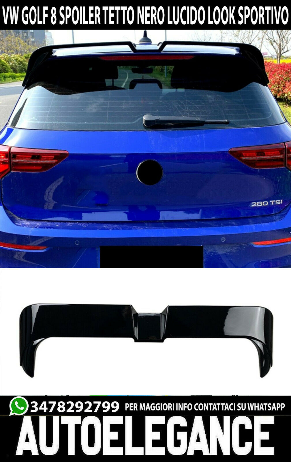 SPOILER TETTO VW GOLF 8 VIII 2019+ POSTERIORE NERO LUCIDO ABS ALETTONE SPORTIVO