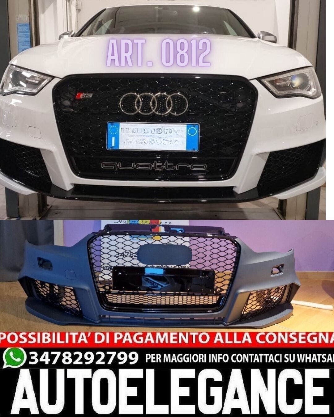 PARAURTI ANTERIORE ADATTO PER AUDI A3 8V 2012-2016 LOOK RS3 + GRIGLIA QUATTRO