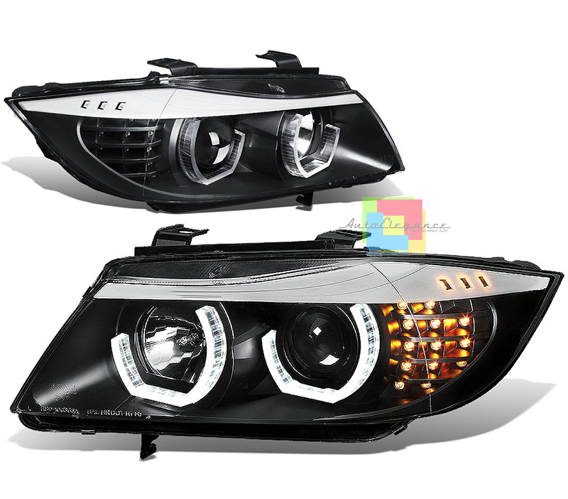 BMW SERIE 3 E90 E91 2004-2011 FARI ANTERIORI NERI CON ANGEL EYES LED BIANCHI CON