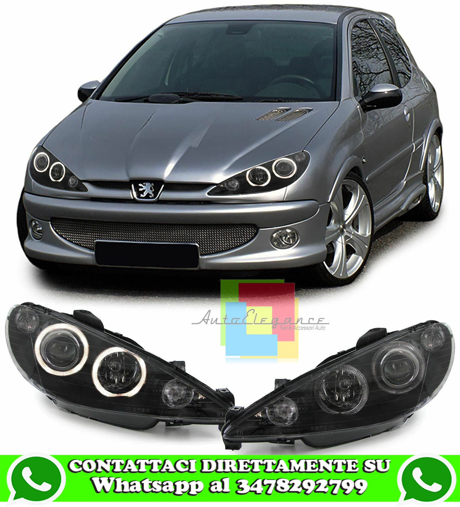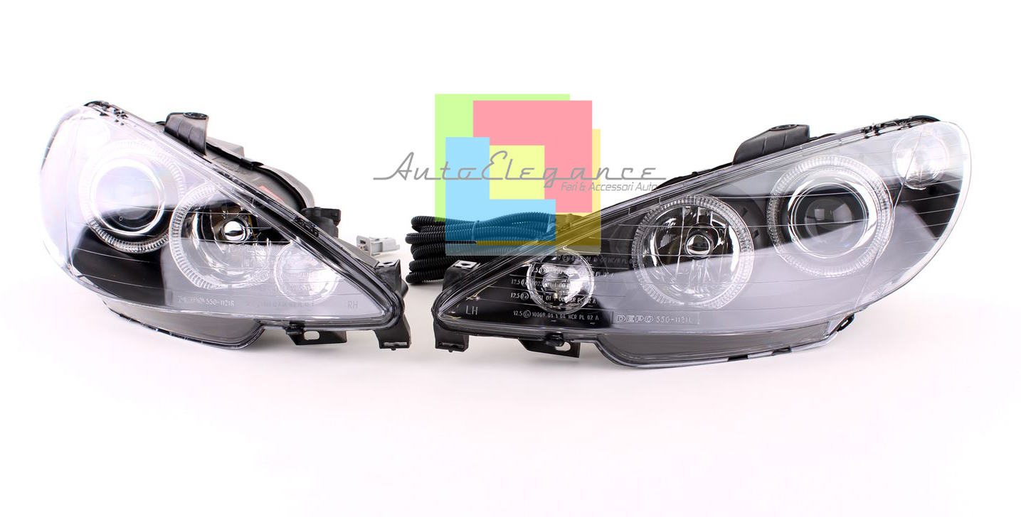 PEUGEOT 206 1998-2002 FARI ANTERIORI NERI LENTICOLARI ANGEL EYES LED