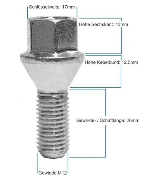 Radschrauben Radbolzen 10x Kegel M12 x 1,5 x 26mm f?r BMW Alufelgen Stahlfelgen